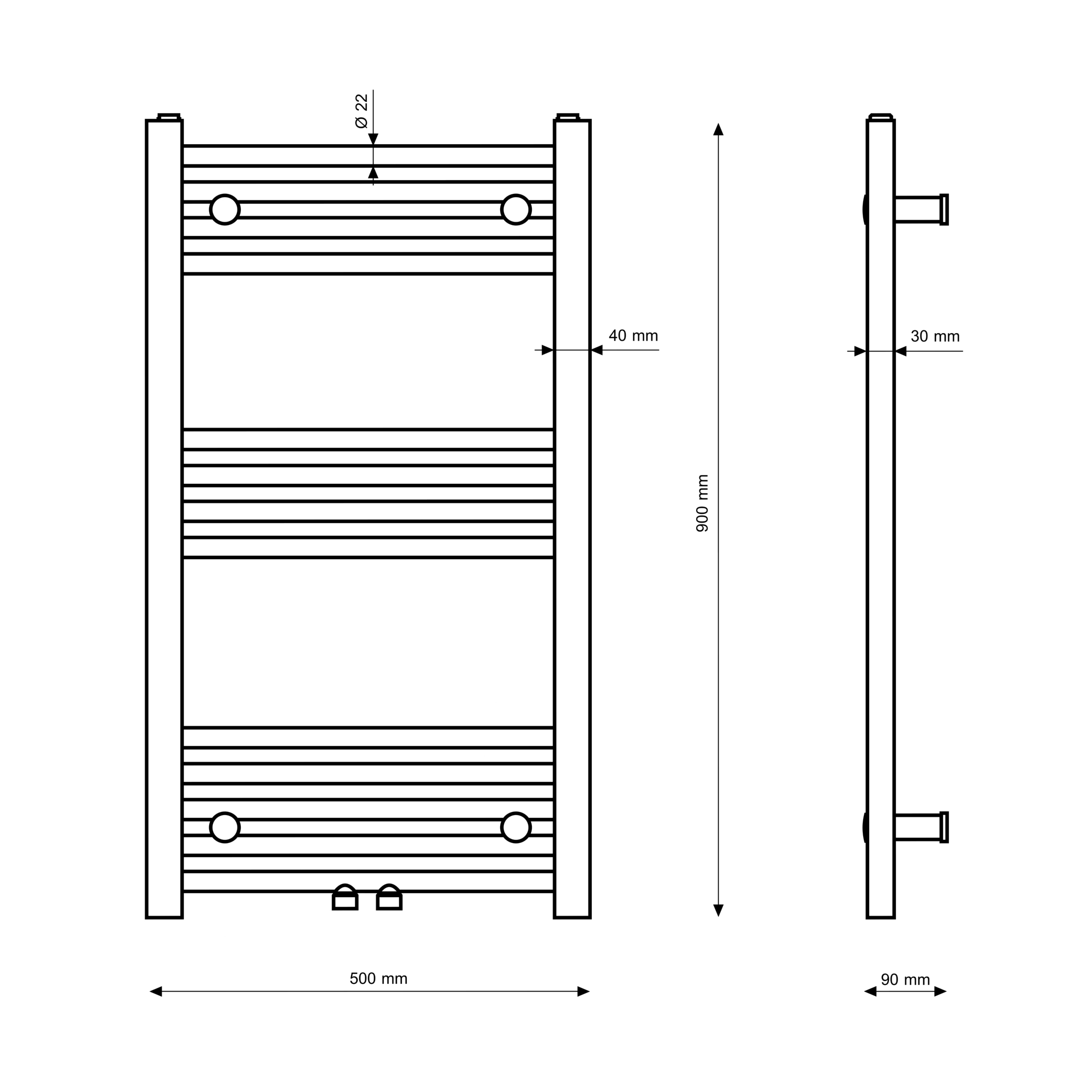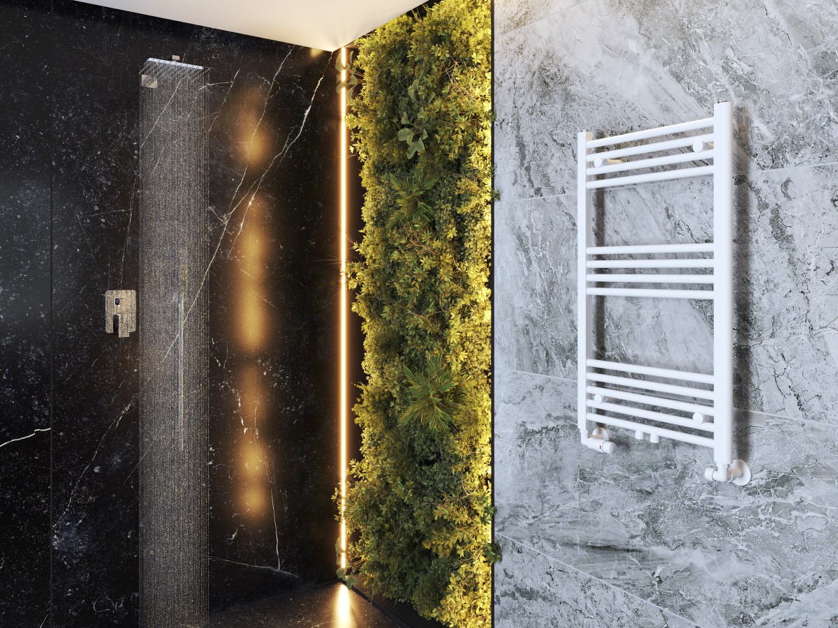 - Wymiary grzejnika wynoszą 90×50 cm, co czyni go idealnym rozwiązaniem nawet w niewielkich przestrzeniach łazienkowych.
