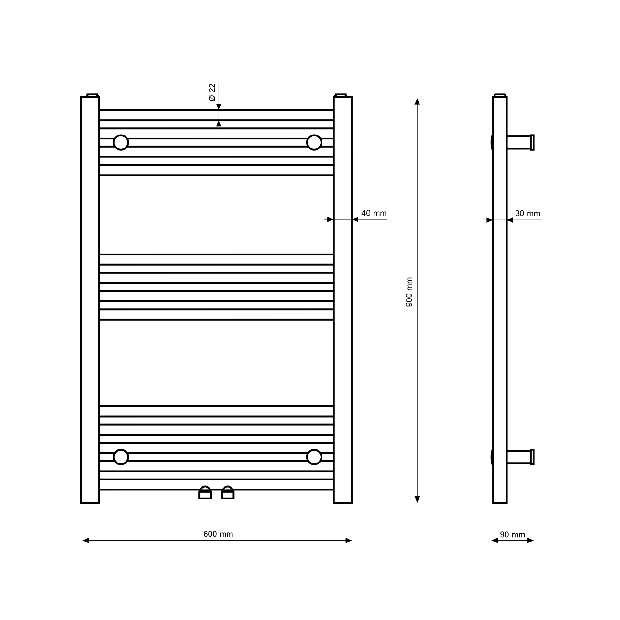 - Przyłącza: 2x G ½″ na środku i 4x G ½″ na dole po prawej i lewej stronie grzejnika.