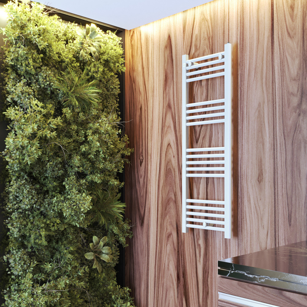 Minimalistyczny design grzejnika PUERTO 40/120 podkreśla elegancki, ale subtelny charakter łazienki. Biały kolor idealnie współgra z jasnymi i ciemnymi aranżacjami, dodając przestrzeni świeżości. Dzięki niewymuszonej estetyce grzejnik świetnie wpasowuje się w różnorodne style wnętrzarskie, od klasycznych, przez skandynawskie, po industrialne i nowoczesne. Jego uniwersalny wygląd sprawia, że jest to produkt ponadczasowy.