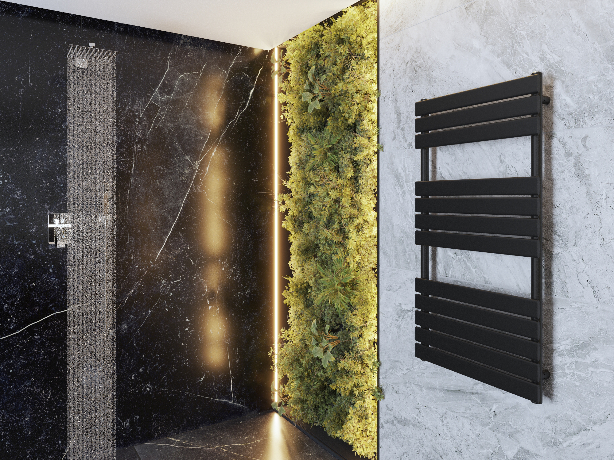 Czarny kolor oraz minimalistyczny design sprawiają, że grzejnik OSLO nie tylko spełnia swoją praktyczną funkcję, ale także staje się ważnym elementem dekoracyjnym w łazience. Poziome, płaskie belki dodają mu elegancji, dzięki czemu pasuje do modnych wnętrz utrzymanych w nowoczesnym lub industrialnym stylu. To świetny wybór dla osób, które chcą połączyć komfort termiczny z designerskim wyglądem swojej łazienki.