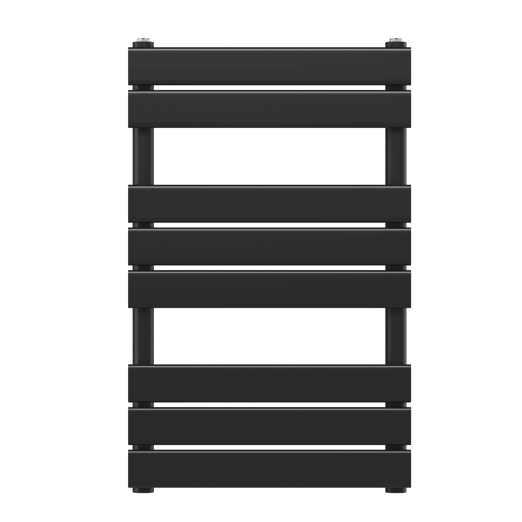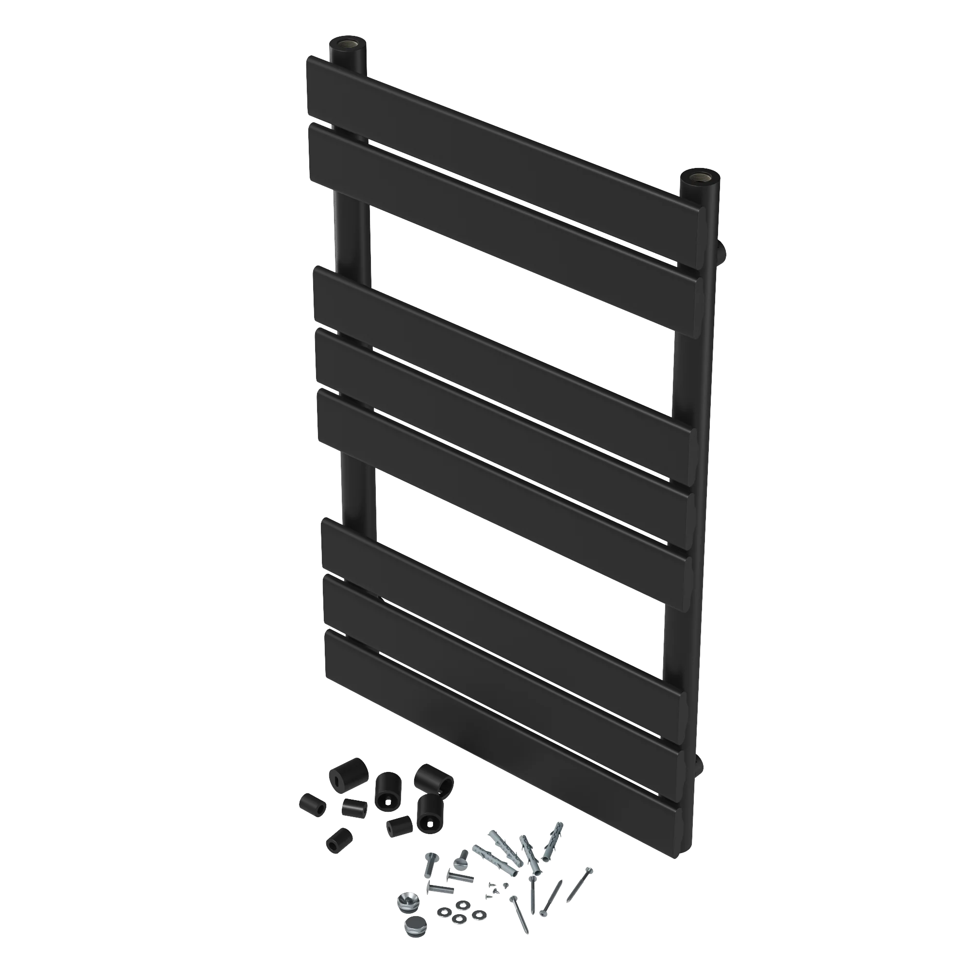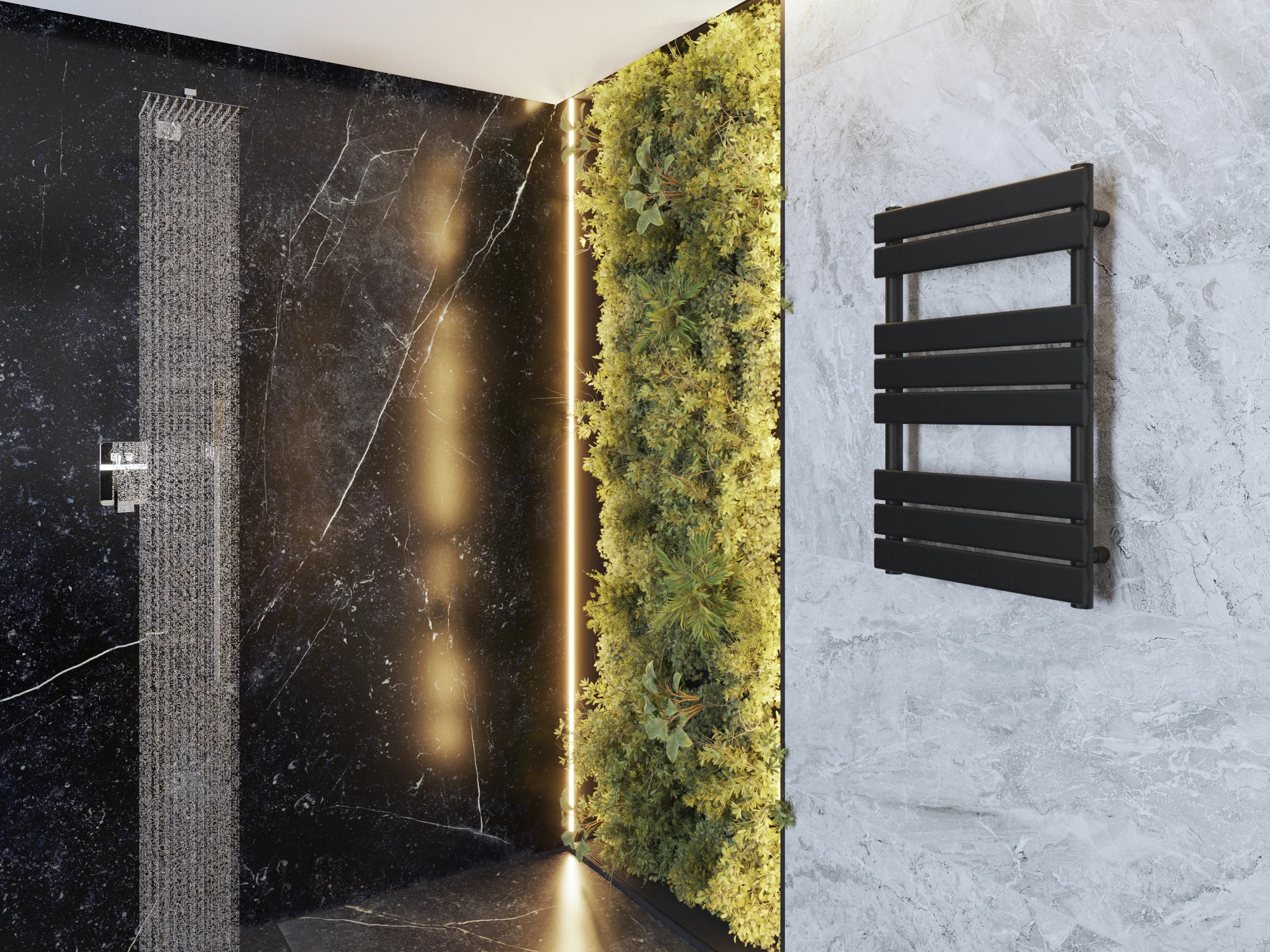 Grzejnik wyposażony jest w płaskie belki poziome, które nie tylko nadają mu elegancji, ale także umożliwiają wygodne suszenie ręczników, bielizny czy drobnych elementów odzieży. Jego matowa, czarna powłoka sprawia, że jest łatwy do utrzymania w czystości, a jego wytrzymałość i uniwersalność wyróżniają go wśród innych produktów dostępnych na rynku.