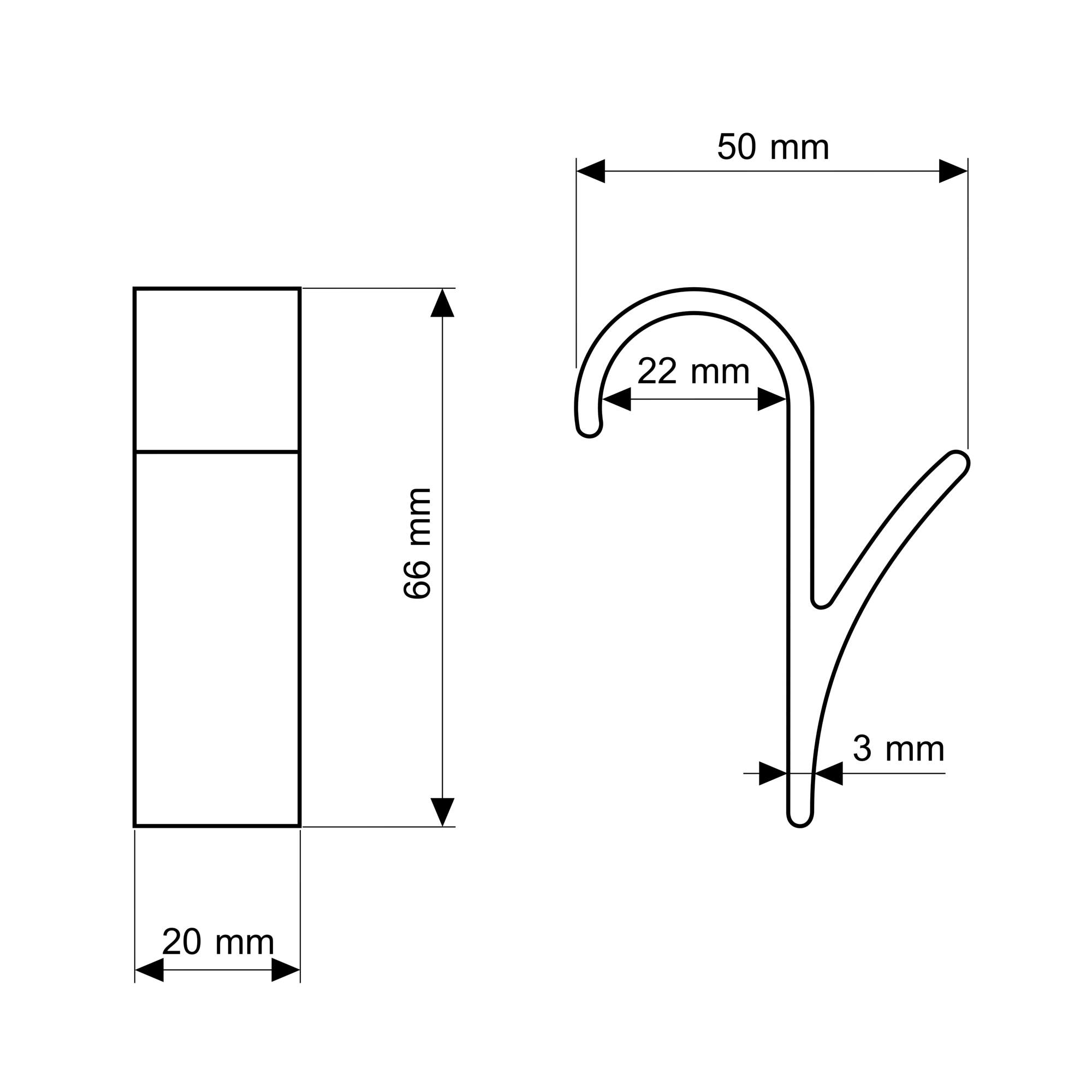 • Wymiary: wysokość 66 mm, szerokość 20 mm, grubość elementu 3 mm